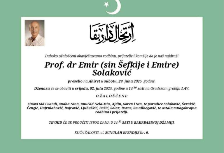 Dženaza doktora Emira Solaković će se klanjati u srijedu, 02. jula, u 14:30 sati na Gradskom groblju Lav.