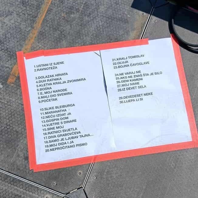 Internetom se proširila fotografija navodnog popisa pjesama koje će Marko Perković Thompson pjevati na sutrašnjem koncertu na zagrebačkom Hipodromu. Mediji pišu da je lista vjerojatno procurila s tonske probe, no zasad nije potvrđeno je li to doista prava lista pjesama, piše Index.hr