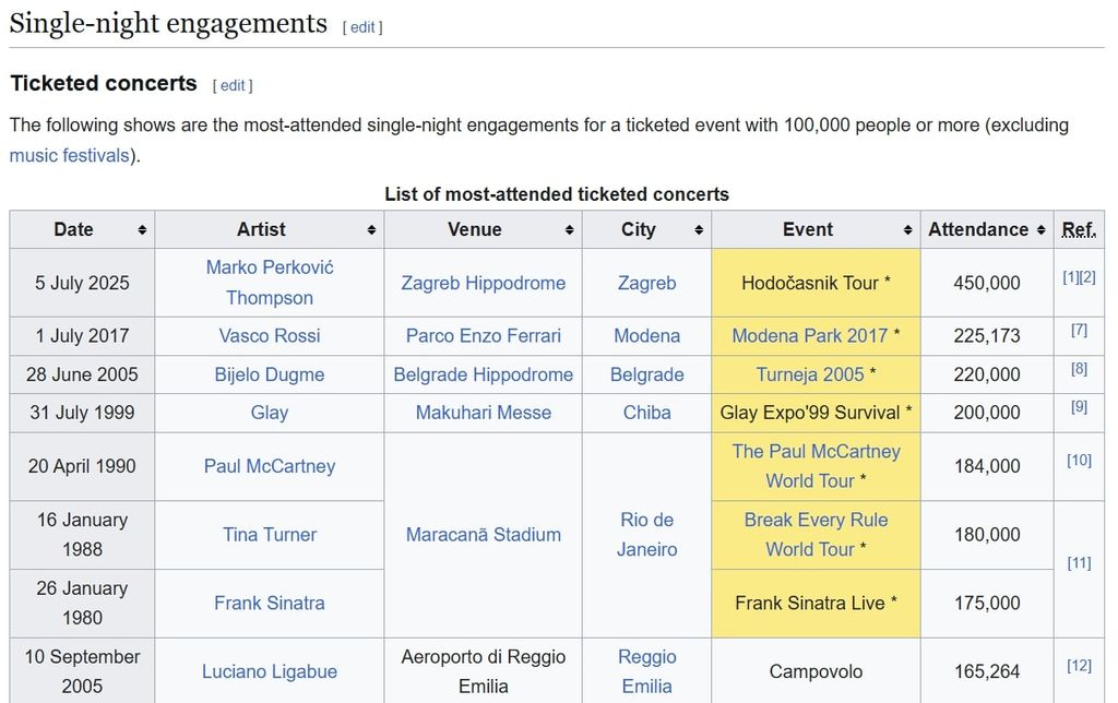 Internetska enciklopedija Wikipedia ažurirala je svoj popis najposjećenijih koncerata s prodanim ulaznicama, a na prvo mjesto zasjeo je upravo koncert Marka Perkovića Thompsona održan na zagrebačkom Hipodromu.
