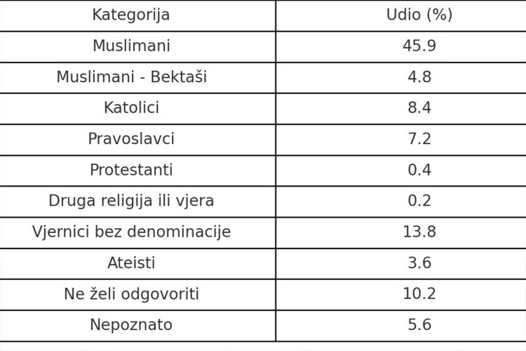 Hrišćana je na popisu 15.6 posto, od toga 8,4 posto katolika i 7,2 posto pravoslavaca. Vjernika bez denominacije je 13,8 posto, a ateista 3,6 posto, prenosi Index.hr.