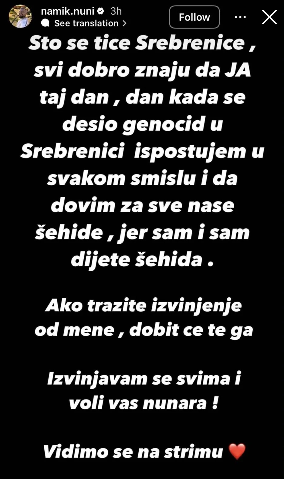 „Što se tiče Srebrenice, svi koji me znaju znaju i da svake godine 11. jula odajem počast žrtvama genocida i da se iskreno molim za naše šehide — jer sam i sam dijete šehida. Ako očekujete izvinjenje — dobit ćete ga. Izvinjavam se svima kojima je moja izjava zasmetala. Voli vas vaš Nunara! Vidimo se na strimu“, poručio je.