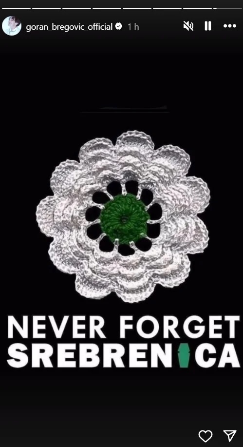 Bregović je podijelio fotografiju sa simbolom Srebrenice – bijelim cvijetom – uz kratak, ali snažan opis: "Never forget".