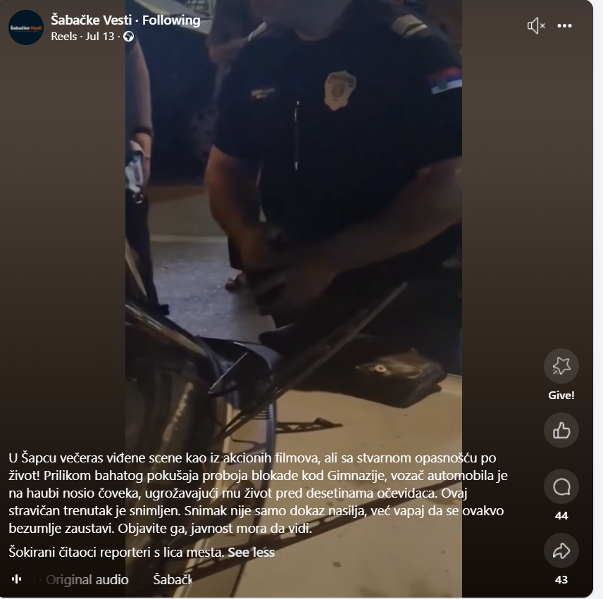 U Šapcu je sinoć došlo do indcidenta kada je vozilo probilo blokadu kod gimnazije. Vozač, koji je jedno vrijeme nosio na haubi mladića, prema informacijama koje su se pojavile na društvenim mrežama, je priveden, dok je nesretni mladić prevezen u bolnicu.
