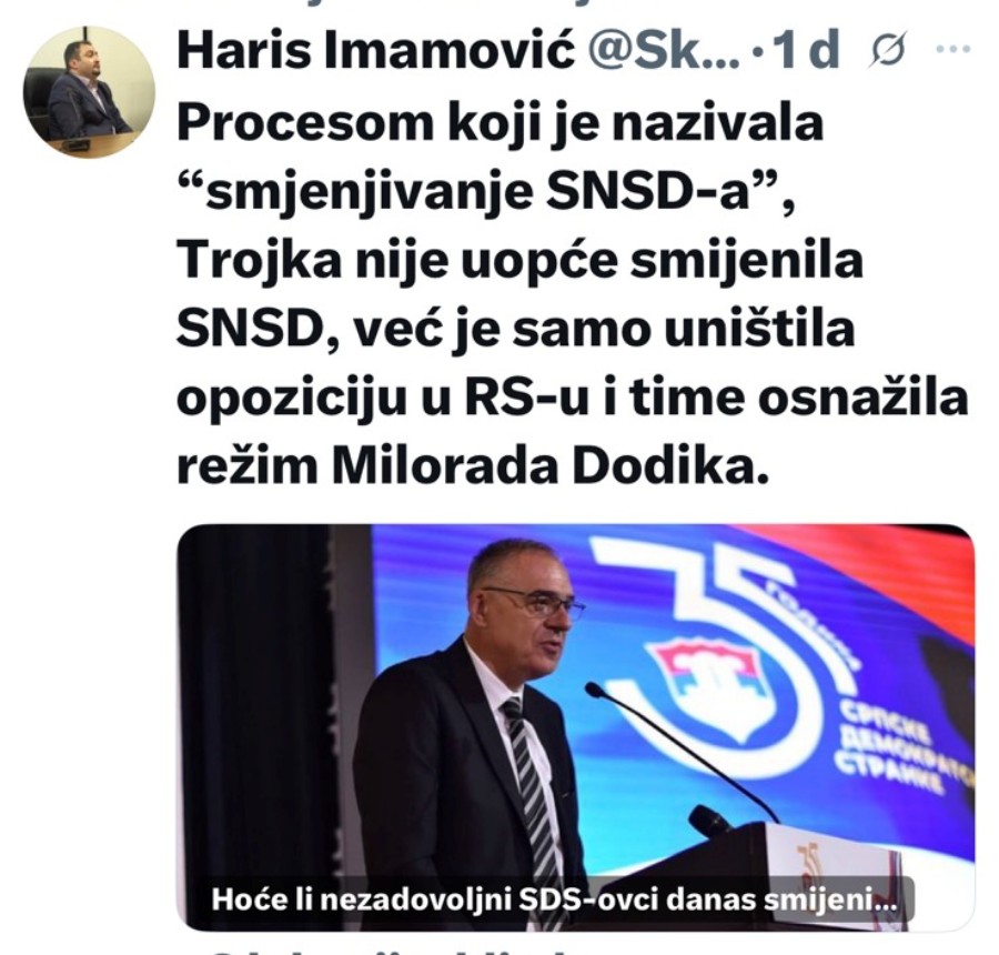 Za situaciju oko SDS-a politički analitičar Haris Imamović krivca vidi u strankama Trojke, kazavši da je procesom koji je nazivala “smjenjivanje SNSD-a”, Trojka nije uopće smijenila SNSD, već je samo uništila opoziciju u RS-u i time osnažila režim Milorada Dodika.