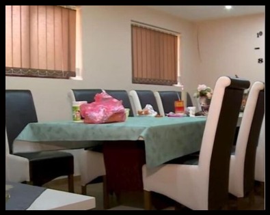 U trpezariji se nalazi veliki sto sa kožnim stolicama, a zid krasi neobičan sat sastavljen od brojeva koji su samo zalijepljeni na zid i zauzimaju veći dio svijetle površine.