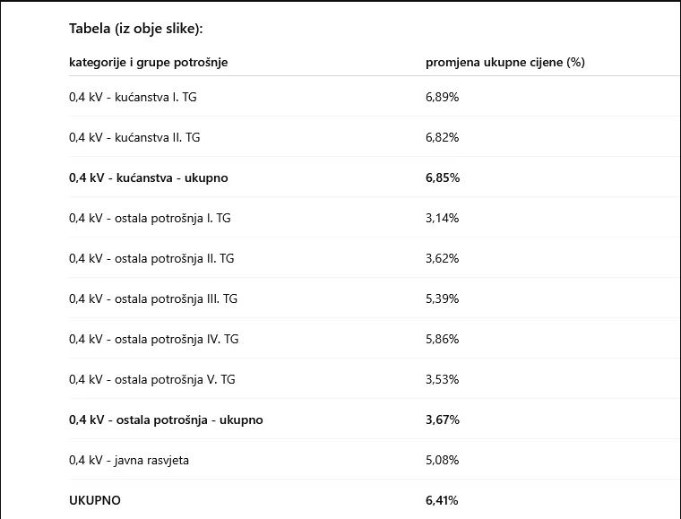 Prosječna promjena cijene opskrbe kod javnog opskrbljivača po kategorijama i grupama potrošnje iznosi: