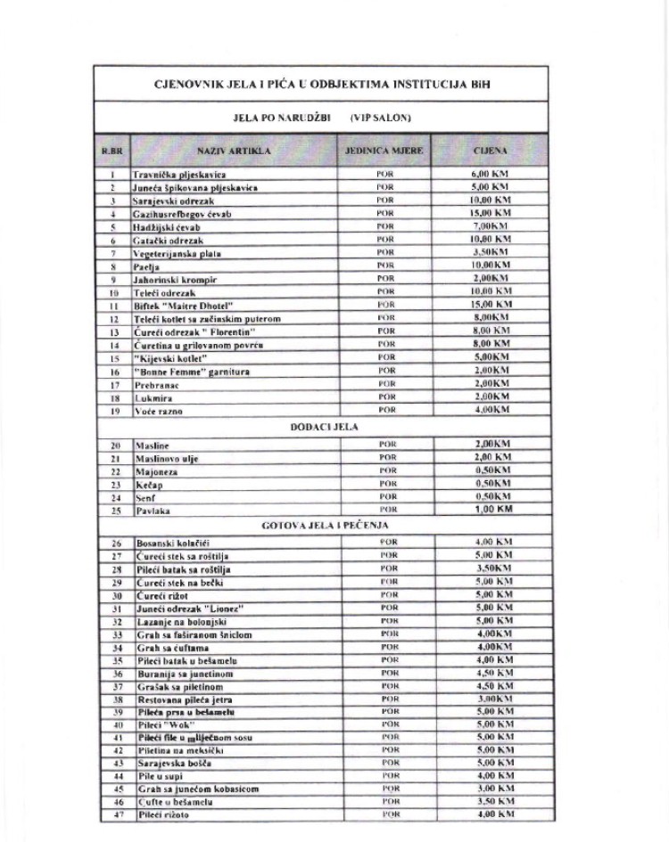 Poskupljuje hrana u restoranu Parlamenta BiH: Teleće pečenje ide na 6,5 KM, kafa 1,5 KM (CJENOVNIK)