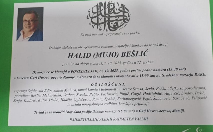 Dženaza će se klanjati u ponedjeljak, 13. oktobra, poslije podne namaza u 13:30 sati, u haremu Gazi Husrev-begove džamije, dok će ukop biti obavljen na Gradskom mezarju Bare u 15:00 sati. Istog dana, poslije ikindije namaza, u 16 sati u Gazi Husrev-begovoj džamiji, bit će proučen i tevhid.