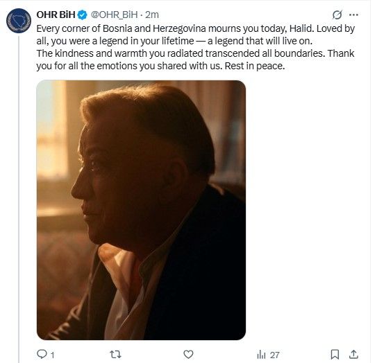 "Svaki kutak Bosne i Hercegovine danas tuguje za tobom, Halide. Voljen od svih, bio si legenda za života, legenda koja će nastaviti da živi. Dobrota i toplina koje su iz tebe zračile prevazilazile su sve granice. Hvala za sve emocije koje si podijelio sa nama. Počivaj u miru", poručili su iz OHR-a.