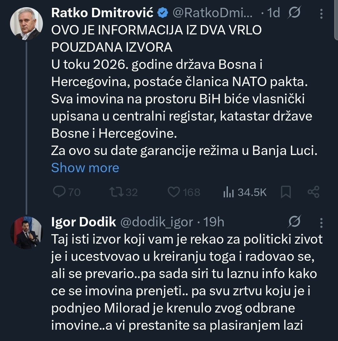 - U toku 2026. godine država Bosna i Hercegovina, postaće članica NATO pakta. Sva imovina na prostoru BiH biće vlasnički upisana u centralni registar, katastar države Bosne i Hercegovine. Za ovo su date garancije režima u Banja Luci. Videćemo - napisao je Dmitrović.