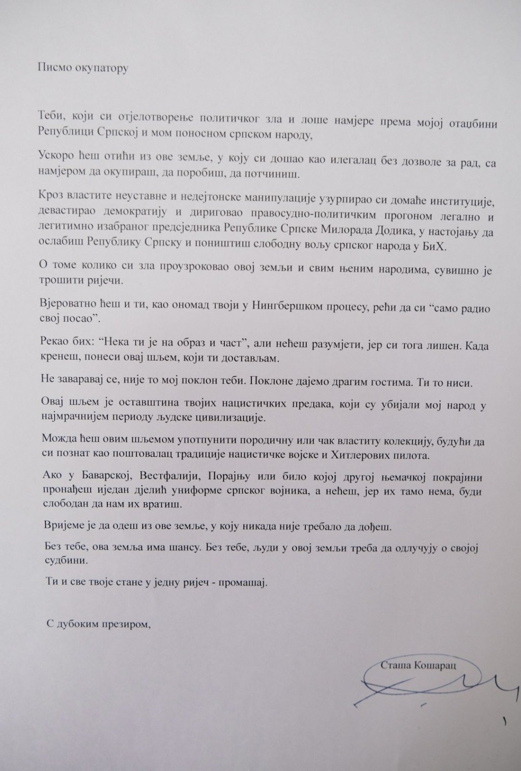 "Tebi, koji si otjelotvorenje političkog zla i loše namjere prema mojoj otadžbini RS (Košarac je rođen u Sarajevu, op.pr.) i mom ponosnom srpskom narodu; Uskoro ćeš otići iz ove zemlje, u koju si došao kao ilegalac bez dozvole za rad, sa namjerom da okupiraš, da porobiš, da potčiniš. Kroz vlastite neustavne i nedejtonske manipulacije uzurpirao si domaće institucije, devastirao demokratiju i dirigovao pravosudno-političkim progonom legalno i legitimno izabranog predsjednika RS Milorada Dodika, u nastojanju da oslabiš RS i poništiš slobodnu volju srpskog naroda u BiH.