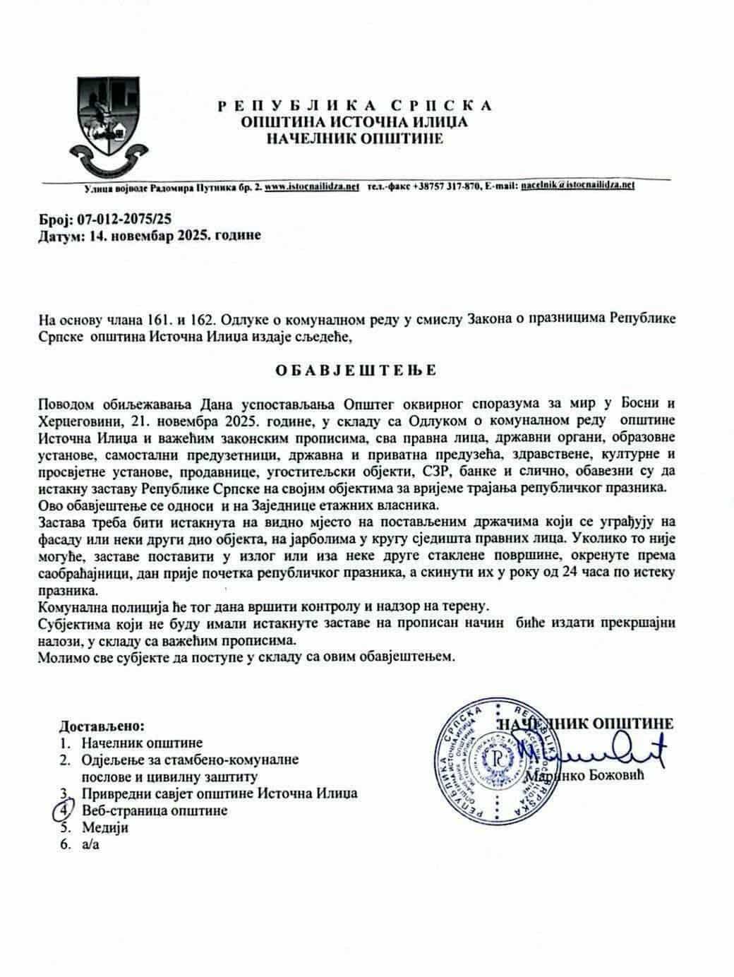 Načelnik Opštine Istočna Ilidža, Marinko Božović (SDS), izdao je zvanično obavještenje kojim se nalaže svim pravnim i fizičkim licima da 21. novembra, povodom Dana uspostavljanja Općeg okvirnog sporazuma za mir u BiH, istaknu zastavu Republike Srpske na svojim objektima.