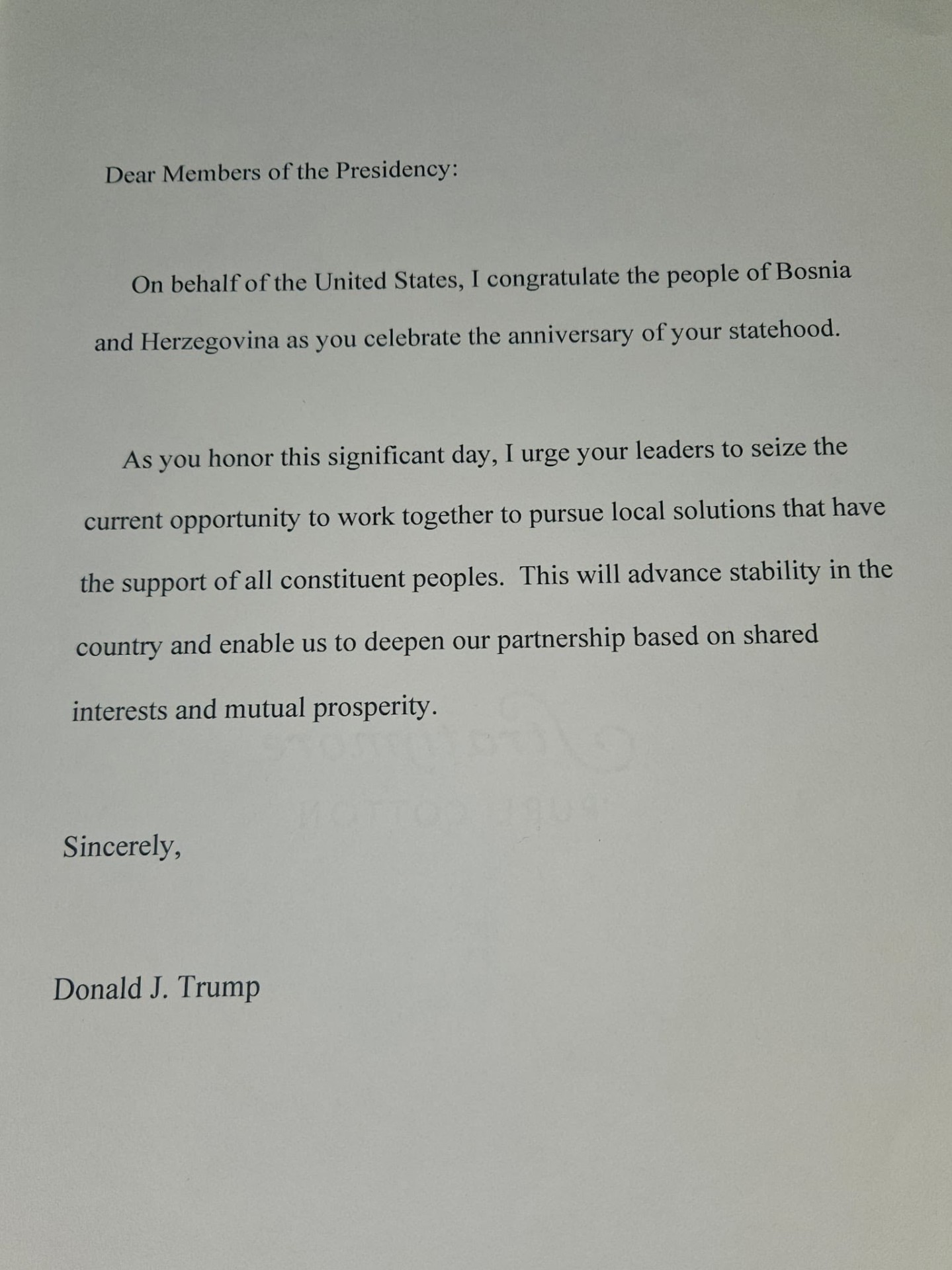 - S poštovanjem, Donald J. Trump, stoji u čestitci naslovljenoj na predsjedavajućeg Željka Komšića.