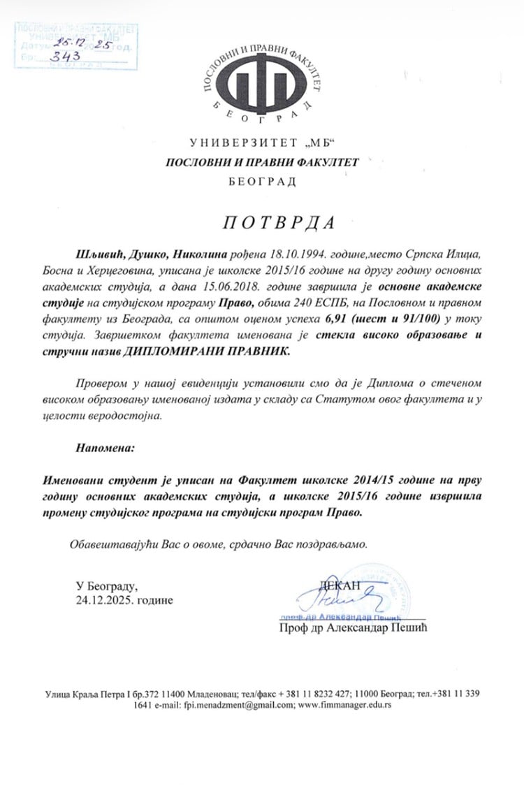 "U tom kontekstu, zloupotrijebljena je i informacija o fakultetu na kojem nikada nisam studirala, što su i sami javno potvrdili. Studirala sam na drugoj visokoškolskoj ustanovi, čiju zvaničnu potvrdu o studiranju, hronologiji i sticanju diplome ovim putem i objavljujem.