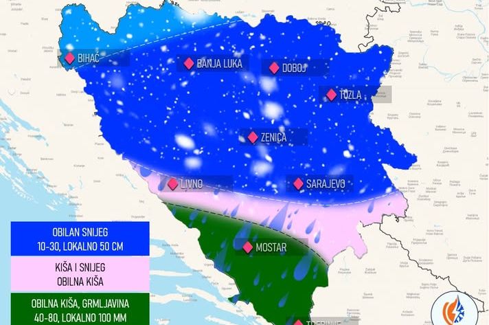 "Većinu očekuje 10-30, lokalno i do 50 cm snijega. Dijelovi jugozapadne Bosne, sjevera Hercegovine i jugoistoka Bosne na granici kiše i snijega, ali većinom bi trebala biti kiša, lokalno i obilnija. Najviše padavina u Hercegovini i na jugozapadu Bosne gdje količina padavina do ponedjeljka može prelaziti lokalno 100 mm, a većinom se očekuje od 40 do 80 mm. Obilne padavine kreću od večeras u Hercegovini, a sutra od jutarnjih sati postepeno i u ostatku zemlje", naveli su.