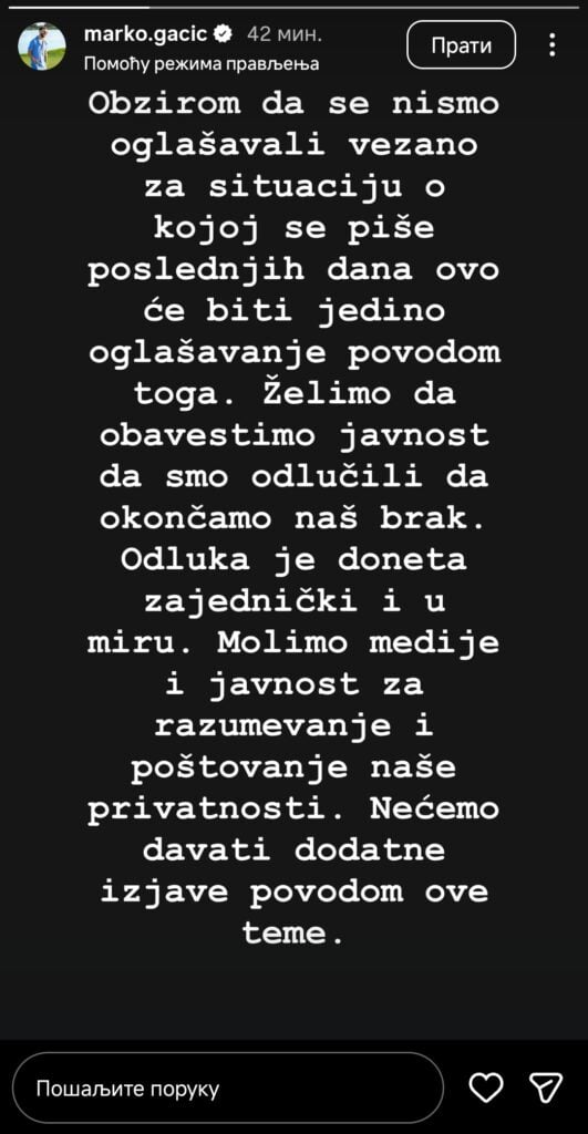 „Obzirom da se nismo ranije oglašavali povodom situacije o kojoj se posljednjih dana piše, ovo će biti jedino saopćenje. Želimo javnost obavijestiti da smo zajednički i u miru odlučili okončati naš brak. Molimo medije i javnost za razumijevanje i poštovanje naše privatnosti. Nećemo davati dodatne izjave o ovoj temi“, napisao je Marko Gačić.