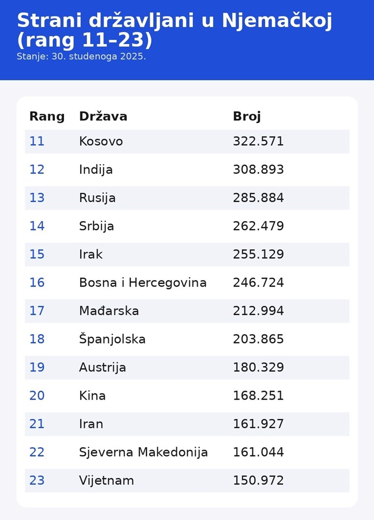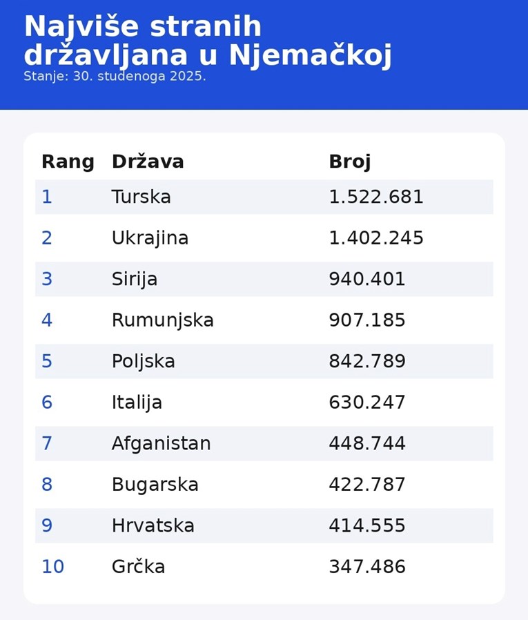 Prema podacima Središnjeg registra stranaca (AZR) sa stanjem na dan 30. studenog 2025., u Njemačkoj je registrirano 1,52 milijuna turskih državljana i više od 1,4 milijuna Ukrajinaca, piše FOCUS.