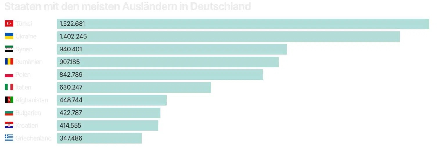 U Njemačkoj je službeno registrovano više od 1,4 miliona Ukrajinaca, čime su postali druga najveća grupa stranaca, odmah iza državljana Turske kojih ima oko 1,52 miliona. Desetljećima su ljudi iz Turske činili najbrojniju grupu stranaca, no ta bi se situacija uskoro mogla promijeniti jer se razlika smanjila na oko 125.000 osoba, pokazuju najnoviji statistički podaci kojima raspolaže Focus.