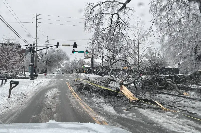 Slushy roads from earlier today have frozen, making travel increasingly hazardous. Downed trees are blocking or partially blocking travel lanes across Nashville. Please stay home if at all possible. Officers are staffing fixed posts across the city, including a Franklin Rd downed… pic.twitter.com/LBAP9wdMvQ