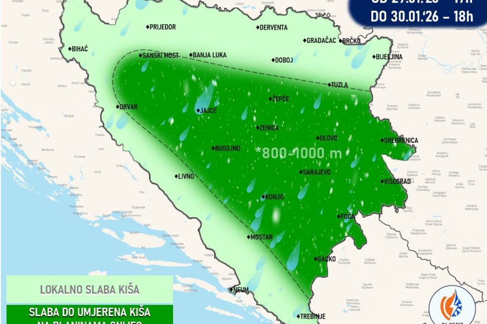 U nizinama će padati kiša, dok se na nadmorskim visinama iznad 800 metara očekuje susnježica i snijeg, uz mogućnost od 5 do 10 centimetara novog snijega na planinama. U ostatku zemlje do petka navečer padavine će biti rijetke i slabe, a u većem dijelu, posebno na sjeveru Bosne, zadržaće se suho vrijeme.