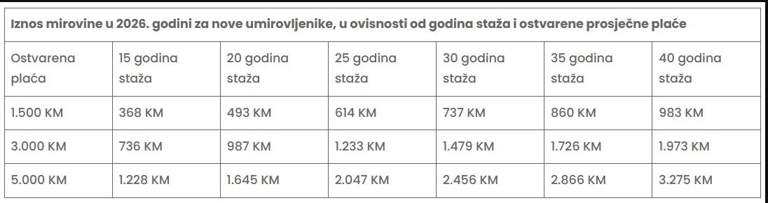 Ukoliko je osiguranik tokom 15 godina rada ostvarivao prosječnu plaću u iznosu od 1.500 KM (za svaku godinu rada), očekivana penzija iznosila bi 368 KM; za 20 godina rada, s ostvarenim plaćama u navedenim iznosima, očekivana penzija iznosila bi 493 KM; za 25 godina rada očekivana penzija iznosila bi 614 KM; za 30 godina rada 737 KM; za 35 godina rada 860 KM; a za 40 godina staža 983 KM.