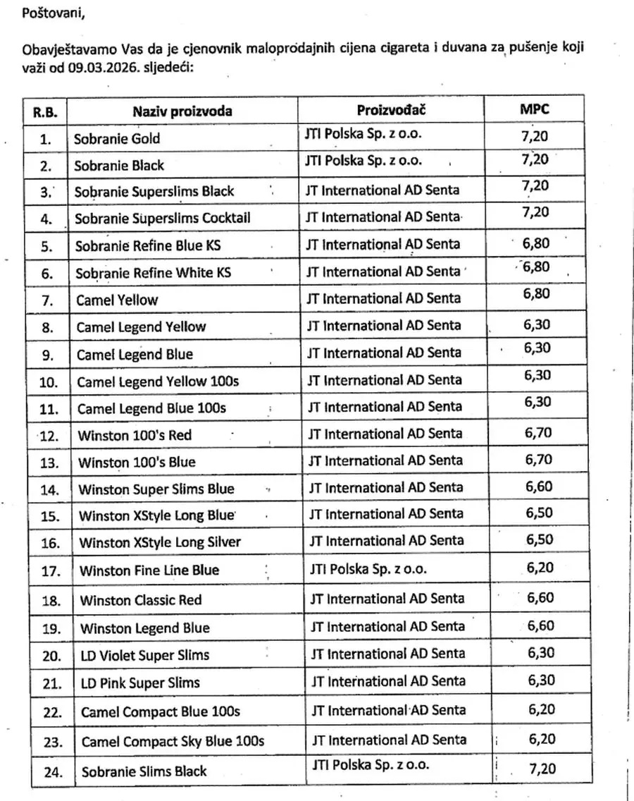 Uprava za indirektno oporezivanje Bosne i Hercegovine obavijestila je o novim malopridajnim cijenama cigareta od tri distributera.