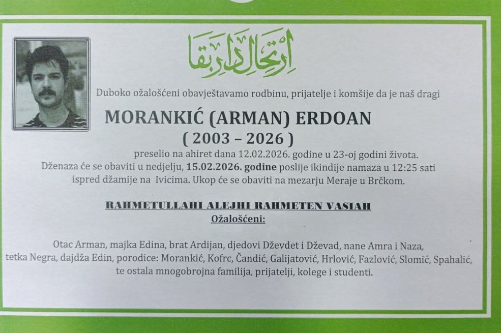 Dženaza mladiću Erdoanu Morankiću, kojeg je usmrtio tramvaj u četvrtak u Sarajevu, klanjat će se sutra u 12:25 sati ispred džamije na Ivicama, a ukop će se obaviti na mezarju Meraje u Brčkom.