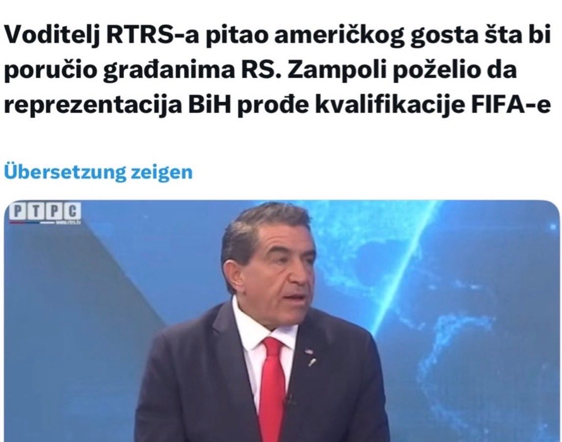 - Divno je predstavljati SAD kad svaki dan imamo sve više prijatelja. Mislim da svi vole mog predsjednika, jer se on zalaže za mir. Čast mi je i privilegija da služim predsjedniku i narodu SAD. On je donio mir u osam zemalja, a uskoro će i u devetoj, za manje od godinu dana svog mandata. Zato radimo na "Trampovoj nagradi za mir". Želimo da se naše zemlje zbliže i drago mi je što sam ovdje kao visoko rangirani vladin zvaničnik i što mogu da pokažem dobru volju da nas još više ujedinim, u svim sferama, od poslovanja do sportske, kulturne i javne diplomatije. Republika Srpska je odnedavno veoma aktivna u svom diplomatskom angažmanu sa SAD - kaže Zampoli.