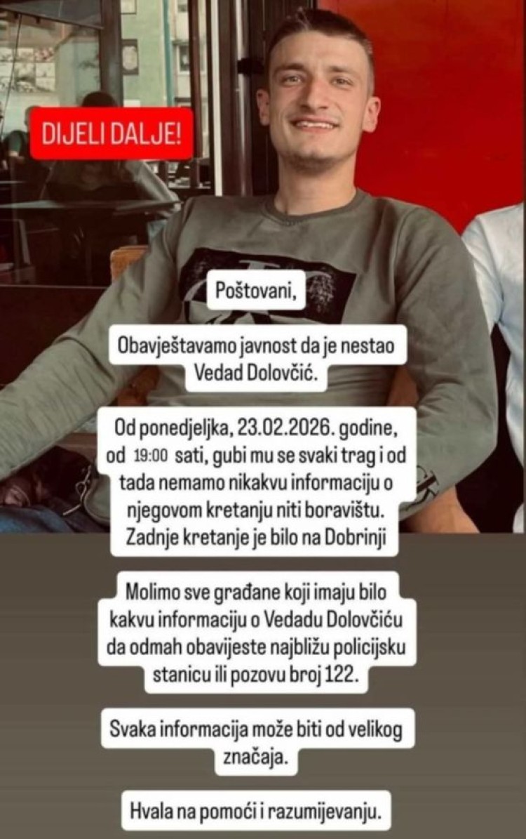 "Molimo sve građane koji imaju bilo kakvu informaciju o Vedadu Dolovčiću da odmah obavijeste najbližu policijsku stanicu ili pozovu broj 122. Svaka informacija može biti od velikog značaja", poručili su.