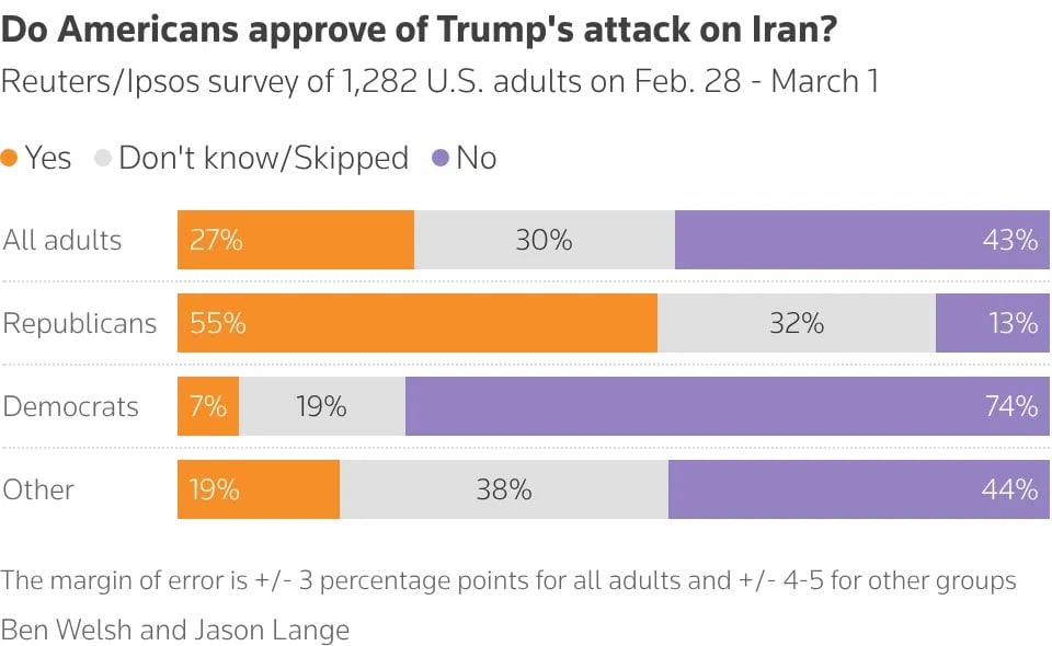 Prema najnovijoj anketi koju su proveli Reuters i Ipsos, samo jedan od četvero Amerikanaca odobrava američke udare koji su ubili iranskog vođu u subotu, dok oko polovine ispitanika, uključujući jednog od četvero republikanca, smatra da je Trump previše spreman koristiti vojnu silu.