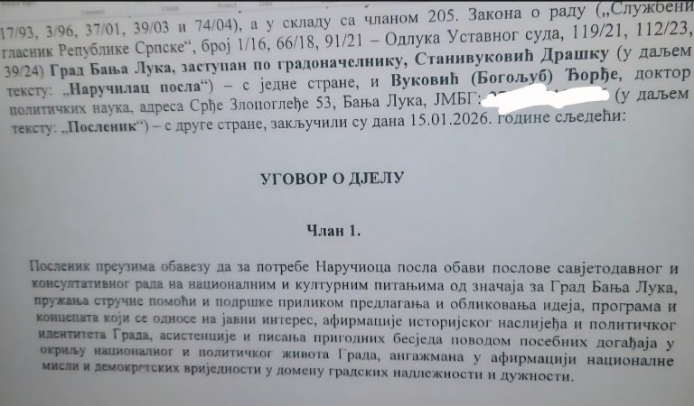 Ugovor se potpisuje i produžava svaka tri mjeseca, ali se strogo držao u javnosti, a zanimljivo da su iz grada Banjaluka pokušali obmanuti mene i javnost tvrdeći da Đorđe Vuković nije savjetnik gradonačelnika, što je sramno. Naime, danima sam čekao odgovor gradonačelnika Stanivukovića i grada Banjaluka da li je Đorđe Vuković angažovan kao savjetnik, a zaniljmivo da sam dobio odgovor da su moje informacije netačne, što je posebno nečasno, da Vuković nije savjetnik, zbog čega bi trebalo povesti istragu jer se službeno plasiraju lažne i netačne informacije, kao i za plate i naknade iz budžeta za Mirnu Savić Banjac i drugih Stanivukovićevih saradnika.