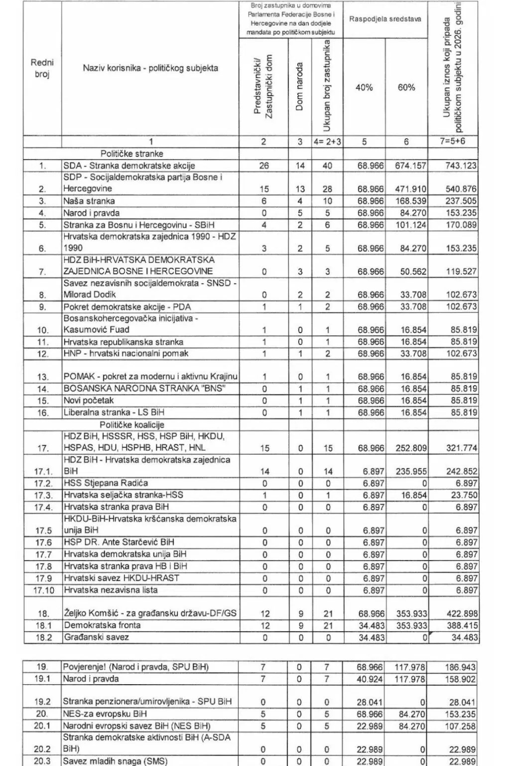 Vlada FBiH pozvala se na član 23. Zakona o izvršavanju Budžeta za 2026. godinu. Na prvom mjestu tabele je SDA koja je dobila 743.123 KM. HDZBiH je u tabeli zastupljen više puta, kao strank ali i kao član određenih koalicina