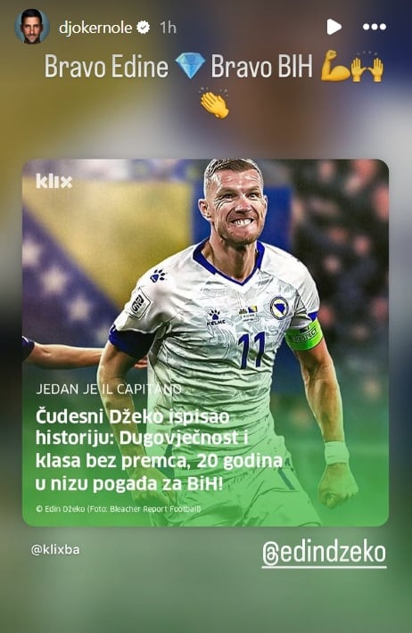 "Bravo, Edine, bravo BiH", napisao je Đoković na svojoj Instagram priči, uz emotikon dijamanta, što je i nadimak kapitena našeg nacionalnog tima