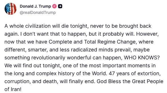 „Cijela civilizacija će večeras umrijeti, i nikada više neće biti vraćena“, započeo je u objavi na svojoj platformi Truth Social.