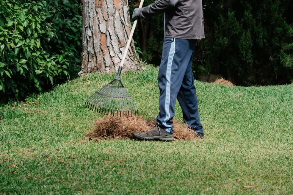 U aprilu, prije svega, travnjak treba dobro pograbiti kako bi se uklonile nečistoće, lišće i mrtve, suhe vlati. To će omogućiti da se procijeni njegovo stanje i započnu daljnje faze proljetne njege. Grabljanje također prozračuje travnjak i lagano rahli tlo. Najbolje je koristiti lepezaste grablje – šire pri osnovi, zahvaljujući čemu se sloj suhe filcane trave temeljito uklanja. Na starijim, zbijenim travnjacima može biti potrebna aeracija (prozračivanje korijena) ili vertikulacija kako bi se travnjak detaljnije očistio. Ako je površina neravna, može biti potrebno i valjanje.