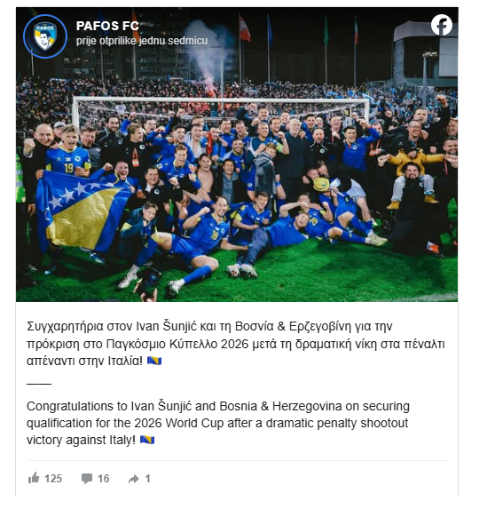 "Čestitke Ivanu Šunjiću i Bosni i Hercegovini na plasmanu na Svjetsko prvenstvo 2026. nakon dramatične pobjede na jedanaesterce protiv Italije", poručili su tada iz Pafosa.