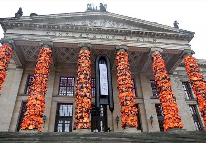 Stubovi berlinske Koncertne dvorane (Konzerthaus) prekriveni su sa 14.000 psluka za spašavanje koje su koristili migranti na putu ka Evropi.