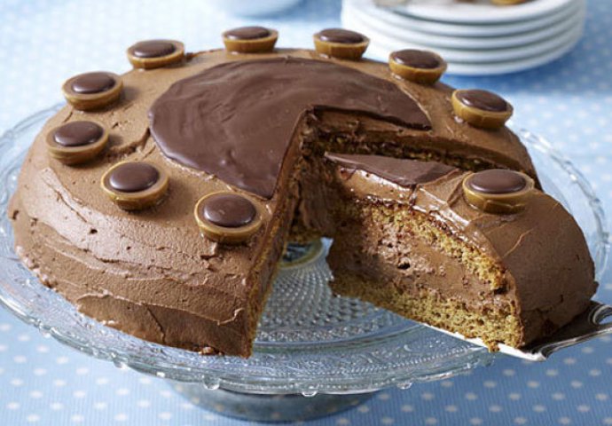 Umutite čvrst snijeg od bjelanaca sa četiri kašike hladne vode i prstohvatom soli, dodajte šećer pomiješan s vanilom i posebno umućena žumanca. Postepeno umiješajte brašno, prašak za pecivo i puding u prahu. Tijesto sipajte u kalup za tortu i pecite u rerni na 175 stepeni oko 25 minuta. Na umjerenoj temperaturi zagrijte slatku pavlaku, dodajte 150 g čokolade i lješnake isječene na krupnije komade. Miješajte dok se čokolada sasvim ne otopi i stavite u frižider da odstoji pet sati. Koru presjecite tako da gornji dio bude tanji, a donji deblji.