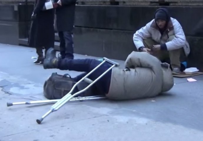 Prvo "uspješan" poslovni čovek je pao sa štakama. Mnogi ljudi su mu odmah pomogli. A pogledajte šta se desilo kada se beskućniku desilo isto...