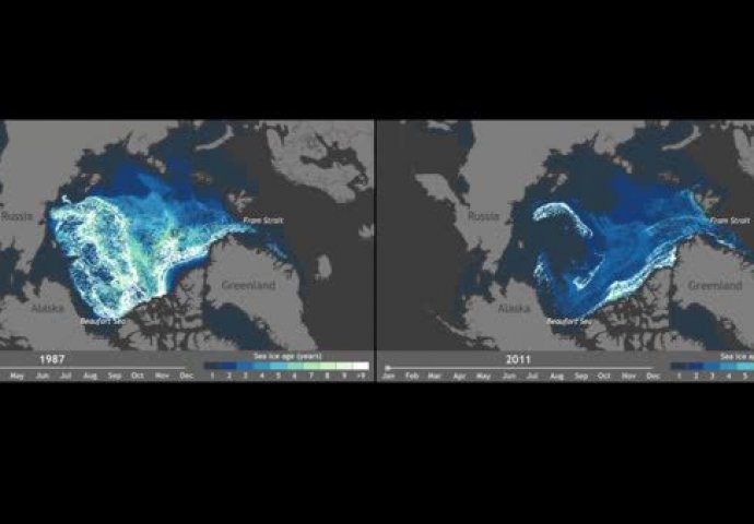 Istraživači s National Oceanic Atmospheric Administration napravili su animaciju koja prikazuje nestanak leda na Arktiku na osnovu podataka unazad 27 godina.