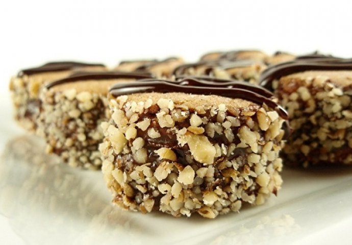 50 g čokolade rastopite s 2 žlice vrhnja u manjoj posudici, te stavite u veću s vrelom vodom da se ne stvrdnjava. Uzmite jedan keksić, stavite na njega žličicu fila (ili radite sa špricom), poklopite s drugim keksićem, pritisnite i odstranite višak fila (debljina fila bi trebala odgovarati debljini keksića). Zatim kistom lagano uokolo fila keksiće natapkajte topljenom čokoladom i uvaljajte u krupnije mljevene orahe. Po želji ih po gornjem dijelu prošarajte čokoladom i stavite kratko u frižider da se rashlade i fil stegne.