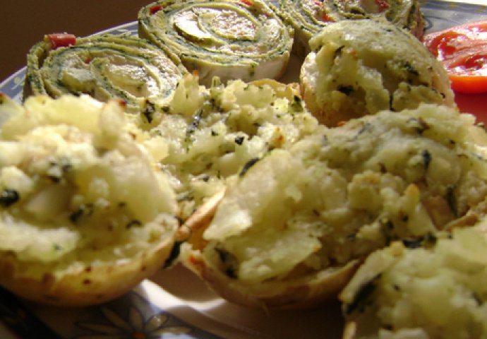 Krompir samo dobro operite, i sa korom stavite peći na 200 stepeni oko 1 sat. Za to vrijeme skuhajte blitvu, prepržite na ulju. Također, na ulju prepržite i svaki luk, da porumeni. Sjedinite sa blitvom i preostalim uljem iz tave. Kad se ohladi dodajte sir, začine, te sve izmiješajte. Nakon sat vremena, krompir izvadite, prepolovite i izdubite mu sredinu. Neka vam ostanu košarice od kore. Sredinu krompira sjedinite sa smjesom od sira i blitve, sve dobro ujednačite i punite kore. Vratite natrag u pećnicu i zapecite još 25 minuta.
