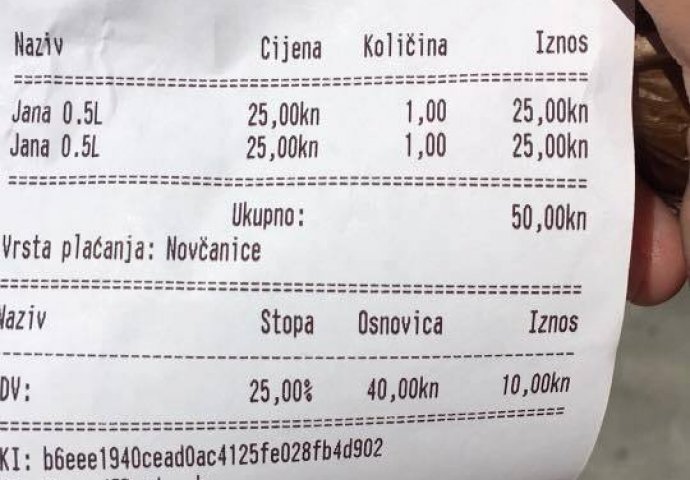 Poznato je da su cijene u restoranima paprene za džep prosječnog građanina BiH, no da ni trgovine nisu više pristupačne dokaz je i račun koji nam je dostavio naš čitatelj. Kaže da je ostao u šoku plativši litar vode Jane 50 kuna odnosno 13 KM! Poređenja radi, u Bosni i Hercegovini litar flaširane vode za piće može se kupiti za jednu KM.