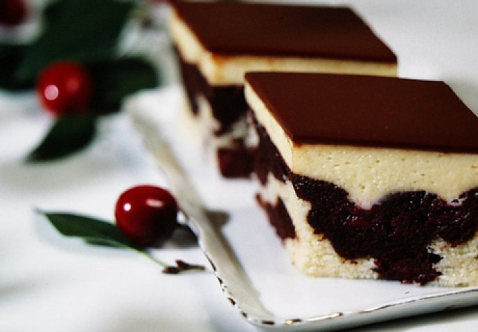 Maslac i šećer pjenasto izmiješajte, dodajte žumanca i mlijeko, a nakon toga brašno izmiješano s praškom za pecivo. Na kraju lagano umiješajte snijeg od bjelanjaka. Polovicu mase ulijte u namašćeni pleh (vel. 35×22 cm), a u preostalu masu umiješajte kakao i cimet, pa je prelijte preko žute mase u plehu. Po tome rasporedite ocijeđene višnje. Pecite u zagrijanoj pećnici oko 35 minuta na 180°C. Dok se biskvit peče, pripremite kremu. Prašak za puding izmiješajte sa šećerom, vanilin šećerom i s malo hladnog mlijeka, a ostalo mlijeko stavite da zakipi. Dodajte mu razmućeni puding i kratko kuhajte, maknite ga s vatre, malo ga ohladite i umiješajte maslac, koji ste pjenasto izmiješali s 2 žlice šećera u prahu. Ohlađenu kremu rasporedite po ohlađenome pečenom biskvitu i prelijte čokoladnom glazurom.